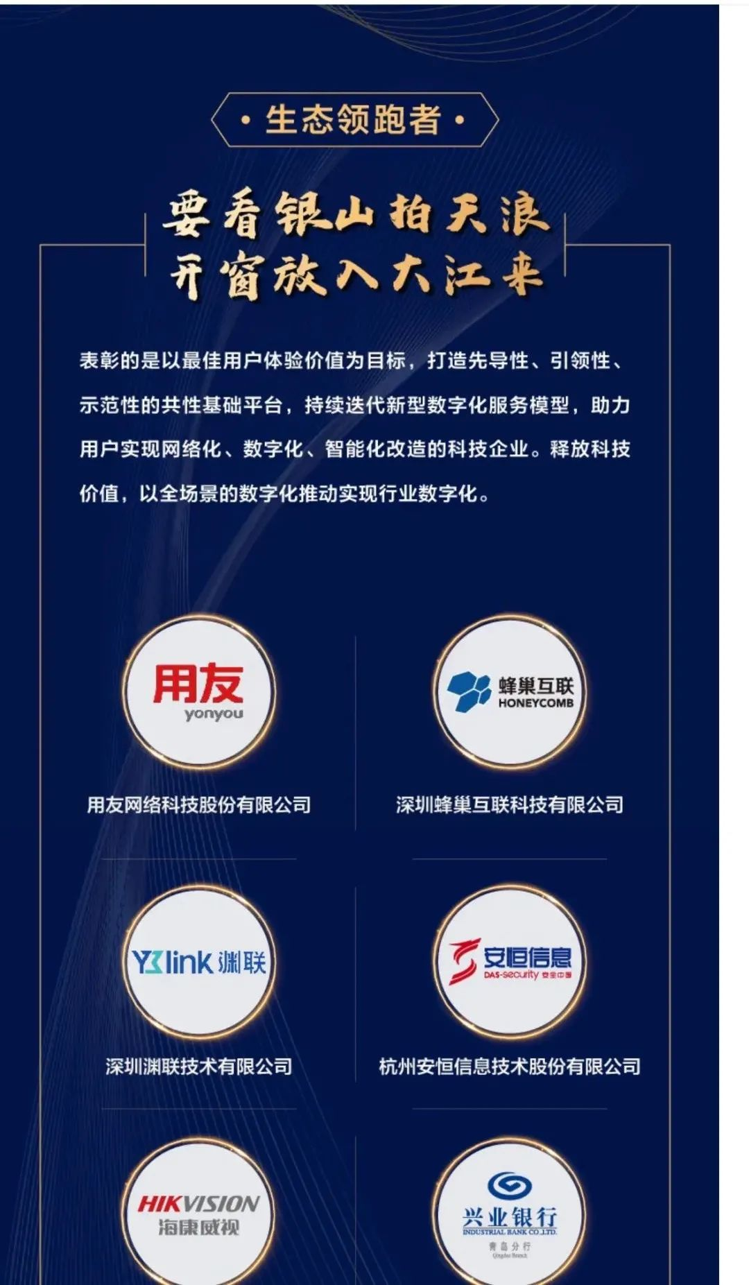 2021年金晖奖,秉承“为用户增值 创共赢生态”的价值理念,面向行业生态全面开放升级。用友网络、德威动力、征和工业、渊联技术等29家企业从近百名报名企业中脱颖而出,分别获得“最佳场景解决方案”、“生态领跑者”、“数字化转型先锋”等奖项,成为新一批指引企业数字化转型的“启明星”。